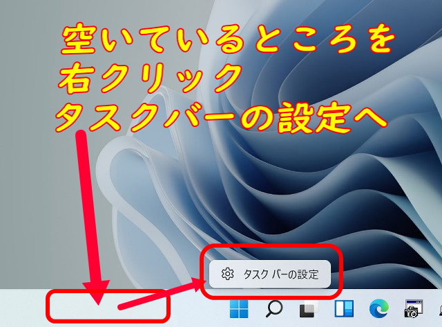 タスクバー上で右クリックを押すと、タスクバーの設定が出てきます。